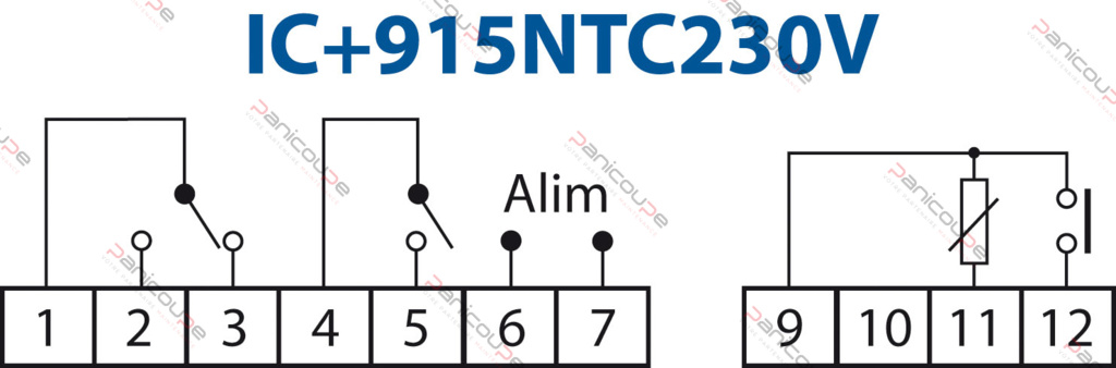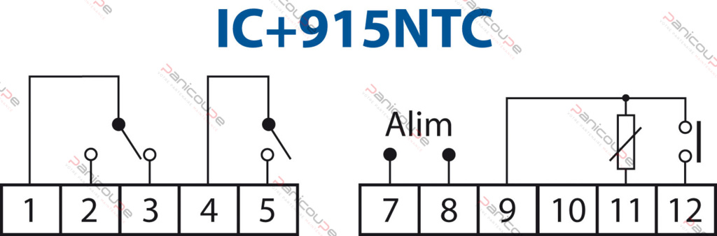 Device replacing IC915 PTC Control range -50 to 140 °C- NTC or PTC SENSOR input 2 relay output SPDT 8(3) A/250 V- 1 digital input- Operation on 1 or 2 setpoints- neutral zone or 2 setpoints- Display on 3 1/2 digits+ sign- Front panel 32 x 74 mm Depth 59 mm Supplied with 1 SENSOR NTC 1,5 m