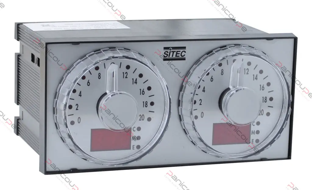 2 graduated dials from 0 to 20 minutes- 1 LED in front of each figure- 2 x 3 digit digital displays- 3 mode LEDS (metering- manual- exclusion) 24 VAC/DC – 50/60 Hz power supply 6 inputs- 6 relay outputs 16A Dimensions: 72 x 72 x 144 (110 with terminal block and dial) Panel cut-out 68 x 138 mm- Connection by supplied 20 pin connector- Specific model for spiral kneader-mixers-