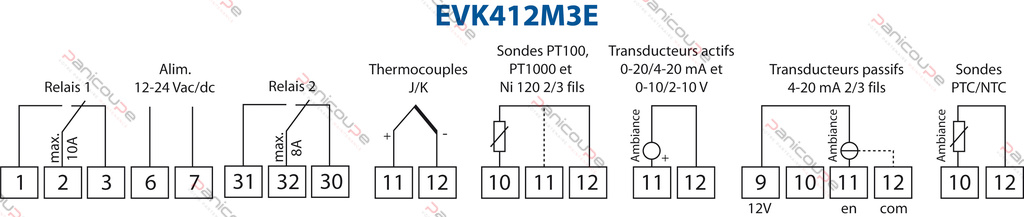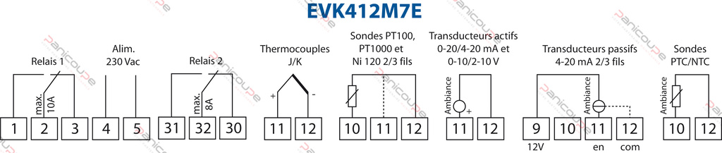 Ref – EVK412M7E: “MultiSENSOR” SENSOR input: TCJ- TCK- PT100 2 and 3 wires – PT1000 2 and 3 wires – 4-20 mA, 0-20 mA, 2-10 V, 0-10 V, PTC, NTC, NI120 2 and 3 wires (not supplied)”; – Voltage 230 Vac