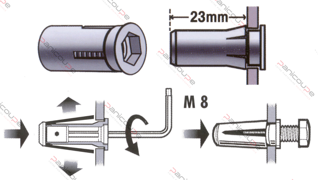Fastener for high-performance anchoring in thin metal walls- M6 hole drilled to 12,5 mm for 1 to 3 mm sheet metal- M8 hole drilled to 14,5 mm for 1 to 3 mm sheet metal