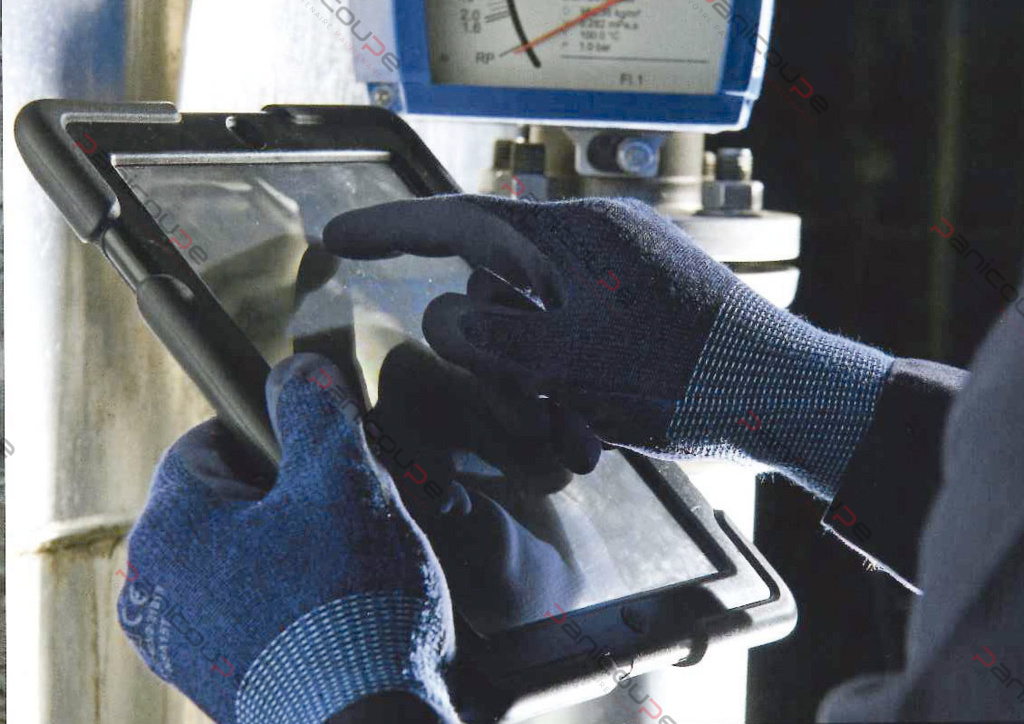 Less effective against cold than NINJA ICE- it offers better grip at positive temperatures and even allows screen use without removing gloves- One-piece knitted (seamless)- Elastic knitted wristband- Uncoated back- Support made of acrylic- polyamide and spandex yarns- DEDICATED textured nitrile coating on the palm to improve protection and grip and ensure a very good grip in wet conditions by evacuating excess fluid from the surface- Blue- gauge 15