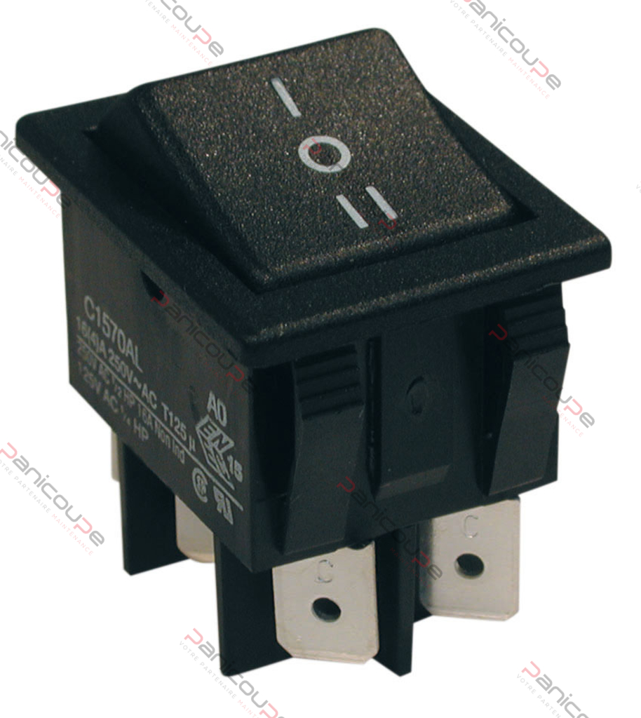 Front snap-in. 6.35 tab connection. Black polyamide body and button. Double-pole 16 A/250 V type. Cut-out 30.2 x 22.2 mm.