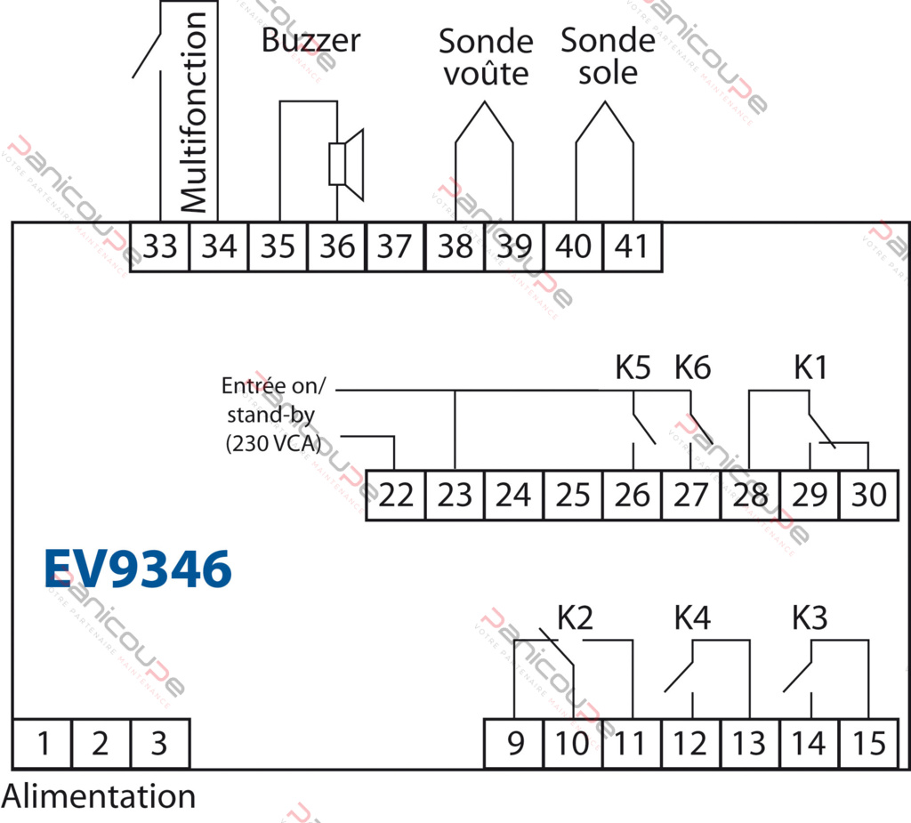 6 configurable 8A/250V relay outputs for adjustment of roof- floor- alarm- lighting- buzzer and on/stand-by output- 2 thermocouple J or K SENSOR inputs (SENSOR not supplied) 2 digital inputs (on/stand-by and multifunction) built-in alarm buzzer- The appliance can operate with 1 or 2 SENSOR- if only one SENSOR is connected- it is possible to manage a floor/vault dosage- Configurable display (possibility of displaying the values on the display of one’s choice)- Fast heating function- 96 x 96 x 65 mm housing- Plug-in terminal blocks IP54 protection- 115/230 V ac power supply K1 – Load: TopRelay: K2 – Load: DeckRelay: K3 – Load: AlarmRelay: K4 – Load: LightingRelay: K5 – Load: BuzzerRelay: K6 – Load: On… Stand-by