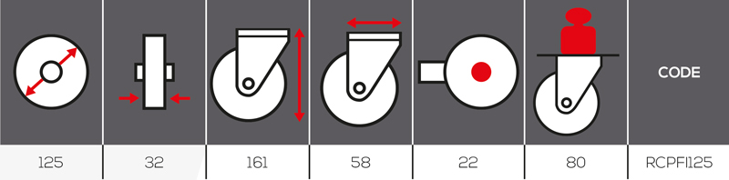 Chape et roue en nylon de haute qualité pivotante, pivot sur double rangée de billes avec tige. Roue en polypropylène avec bandage caoutchouc semi-élastique gris non tachant. Roulements à billes avec pare-fils.