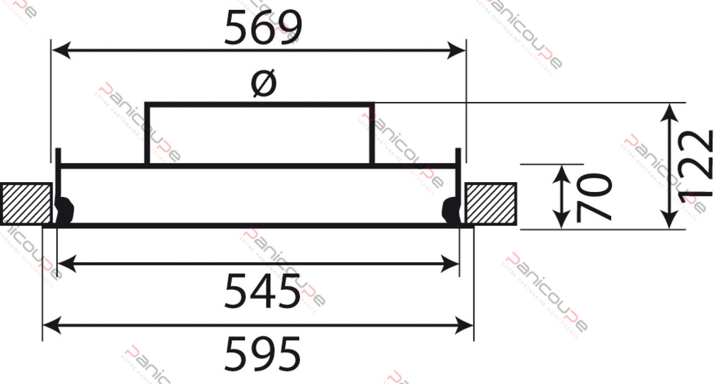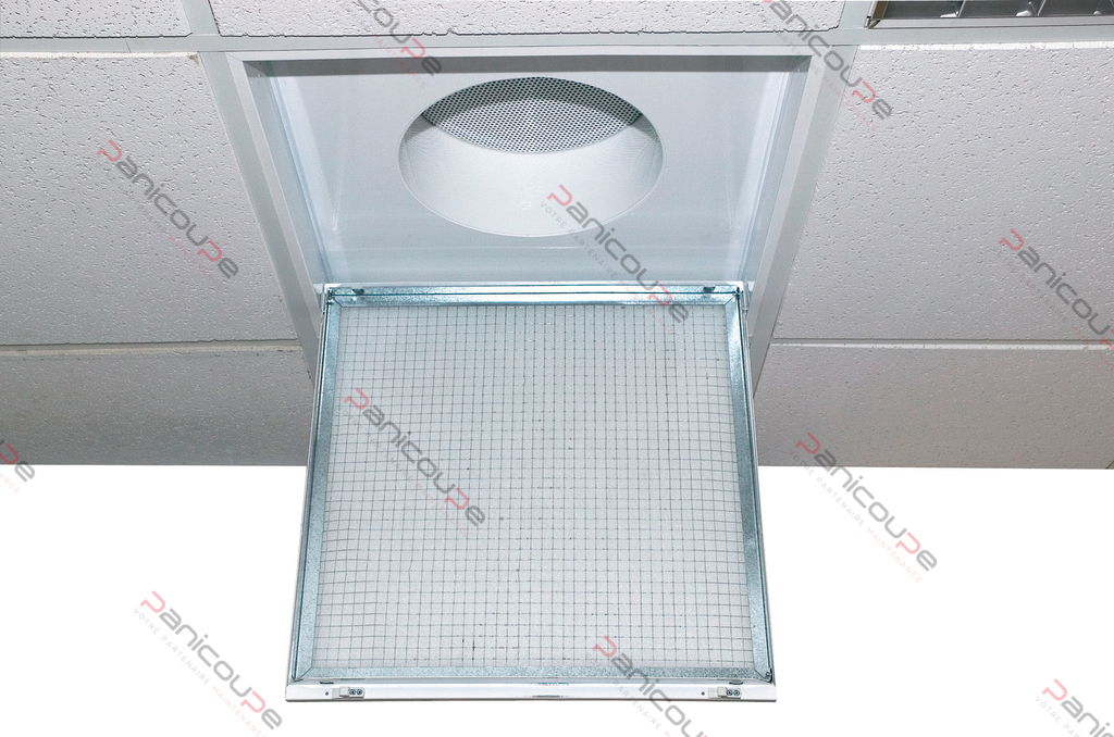 Front panel in white lacquered perforated sheet metal mounted on hinges: opening by simply pressing- Replaces a 600 x 600 mm suspended ceiling tile- Plenum mounted with circular connection on top